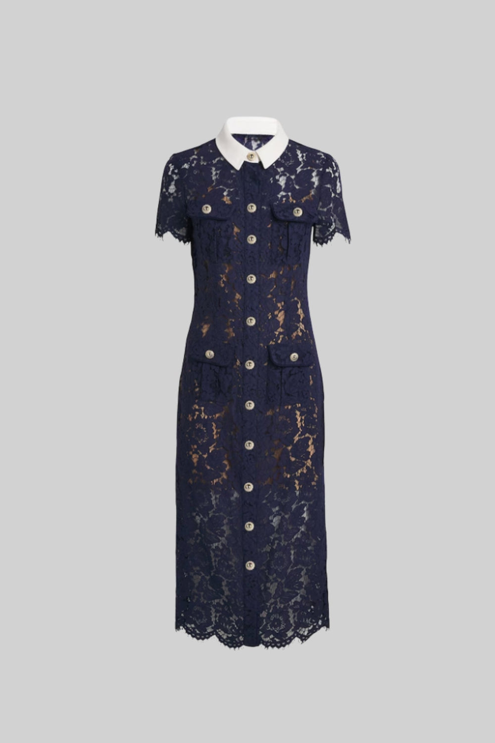 Floral Lace Midi Dress with Tailored Collar and Belted Waist - Navy